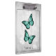 Junte notas e lembretes em uma superfície segura com uma Área de Transferência Personalizada Floral Personalizada da Borboleta Teal. O design da área de transferência apresenta um par de borboletas vibrantes que repousam sobre uma vinha floral branca contra um fundo verde-cinza claro. Itens de presentes adicionais disponíveis com este design, bem como uma variedade de cores.