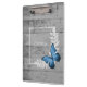 Junte notas e lembretes em uma superfície segura com uma área de transferência personalizada rustica de borboleta azul. A área de transferência design apresenta uma borboleta vibrante que repousa sobre uma folhagem delicada com um espaço para adicionar o seu nome contra um fundo de madeira rústico. Itens de presentes adicionais disponíveis com este design, bem como uma variedade de cores.