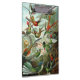 Design de ilustração Vintage da ciência e biologia por Ernst Haeckel. Covarinhos coloridos exóticos numa selva de floresta tropical voando entre as árvores. Um pássaro está sentado em um ninho com ovos.