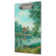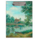 Bancos do Loing em Santo-Mammès. Alfred Sisley. Paisagem rural em tons verdes. Há um barco na margem do rio e árvores crescendo. Há uma casa no outro banco. As nuvens estão correndo pelo céu. Reprodução de famosas imagens de arte no dominio público.