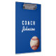 A cor de fundo na frente, o estilo do texto, a cor etc. são personalizáveis para corresponder às cores da equipe e da escola. Backer amplia a textura do baseball com o nome do treinador atrás. "Treinador" também pode ser alterado para corresponder a qualquer título ou nome. Foto original de baseball de Becky Nimoy.
