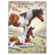 Cavalos castanhos e brancos ficam juntos cercados por flores e árvores florescentes, mostrando a beleza serena da natureza e a ligação entre os animais.
