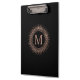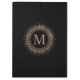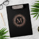 Elegant, personalized clipboard features a sleek black design with a faux rose gold monogram medallion on front and back. NOTE: rose gold is a printed effect with color variations made to mimic real foil; it is not actual gold foil.