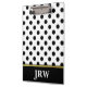Esta prancheta branca tem um teste padrão de bolinhas preto. Personalize sua prancheta com o monograma/iniciais do receptor.