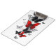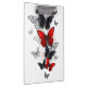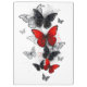 Bando de borboletas voadoras, realistas, vermelhas e pretas em fundo branco com gotas de tinta.