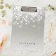 A área de transferência em preto chic apresenta duas linhas de texto personalizado em letras negras clássicas, em um fundo de cinza de prata adornado com um burst de luzes brancas no topo. Design repete-se no lado oposto.