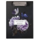 A área de transferência personalizada e elegante para uso profissional ou pessoal apresenta um cluster de rosas roxos e índios profundos, de lavanda pálida, em um fundo escuro e dramático. Personalize com duas linhas de texto personalizado em letras negras modernas em um retângulo branco no centro. O lado inverso apresenta um padrão floral escuro correspondente.