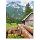 Apresentando um campo de madeira, com toros antigos deitados em uma pilha, enfiados em um vale bem ao lado de uma floresta verde brilhante.
