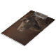 Design apresenta um retrato fotográfico de um cão com cabelo castanho sobre fundo castanho escuro.