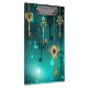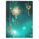 Chaves Douradas e antigas com engrenagens e marcadores penduram em correntes douradas sobre fundo verde luminoso.