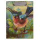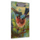 Este impressão colorido ilustra um pássaro azul que repousa num galho numa floresta cheia de flores. Esta vista mostra o pássaro que está prestes a voar. As cores azul-claro, rosa, amarela e verde fazem uma imagem excitante para decoração e acessórios pessoais.