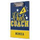 Mostre ao seu treinador favorito um espírito de equipe com esta prancheta personalizável em suas cores de azul real, amarelo e branco.