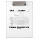 Está aqui um conselho de grampo para todo o estatístico! A prancheta caracteriza a curva de distribuição normal (curva do sino) junto com o seguinte provérbio: "Coma… o sono… pensam estatísticas".