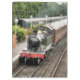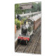 Um trem a vapor bem restaurado e carruagems de uma era passada chegando à estação de trem. Inglaterra Reino Unido.