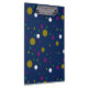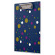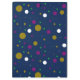 Um padrão de círculos de vários tamanhos em ouro, branco, roxo e verde está espalhado sobre um fundo azul escuro. Os círculos são espaçados uniformemente e variam de diâmetro.