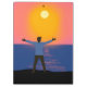 Cumprimento ao Sol. Um homem está em pé em uma praia voltado para o mar aberto e saudando o sol amarelo com os braços levantados.