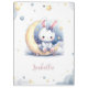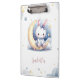Super cute clipboard featuring cute white little bunny wearing a beautiful blue bow sitting on a lovely moon with some gold falling stars and some dusty blue clouds.