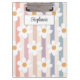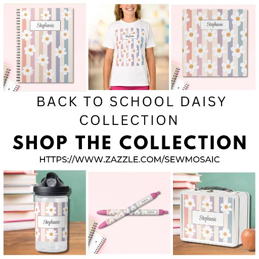 Esta área de transferência floral é decorada com margaridas brancas sobre fundo listrado em cores pastéis. Facilmente personalizável com seu nome. Excelente de volta à escola ou de presente.