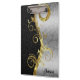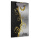 Cor damasco floral moderna, preta e prateada, com uma espiral floral de ouro metálico vertical