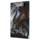 Um dragão majestoso com escamas de cobre, ouro e preto numa borda de penhasco com céus azuis atrás.