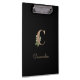A área preta elegante apresenta um monograma botânico dourado no centro.