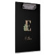 A área preta elegante apresenta um monograma botânico dourado no centro.