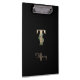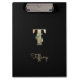 A área preta elegante apresenta um monograma botânico dourado no centro.