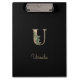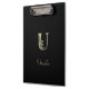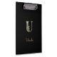 A área preta elegante apresenta um monograma botânico dourado no centro.