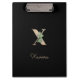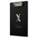 A área preta elegante apresenta um monograma botânico dourado no centro.
