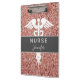 Mantenha a sua documentação em estilo com esta área de transferência de nome da enfermeira Caduceus Pink Rose. É projetado em ambos os lados com fundo brilhante rosa dourado faux glitter e um símbolo caduceus grande no centro da faixa horizontal da cinza. "Enfermeira" está em letras brancas em negrito no centro. Personalizado com o nome no script alfabético tradicional. Faz uma ideia de presente de excelente para uma enfermeira.