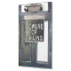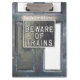 Um design de arte da antiga porta do serviço de reservas na plataforma da estação ferroviária, com um aviso de não admissão e cuidado dos comboios da era do comboio a vapor.