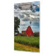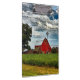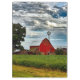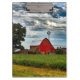 Apresentando um celeiro vermelho rústico com campos de soja em um belo dia com nuvens brancas fofinhas.