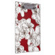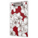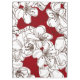 Um desenho embelezado de maçã branca floresce contra um fundo vermelho escuro.
