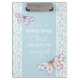 Mantenha-se organizado ao expressar sua fé com esta linda prancheta com o verso bíblia Philippians 4:13, eu posso fazer tudo através de um Cristo que me dá força. Este lindo design de primavera tem um plano de fundo de ondas azul claro e duas borboletas aquáticas. Uma bela maneira de compartilhar o amor do Cristo!
