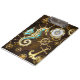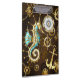 Fundo de madeira castanho com fundo marinho, cordilheira mecânica, volante antigo, âncora de ouro e diversas engrenagens de ouro e latão. Estilo Steampunk.