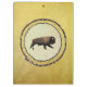 Um bisão galopante é pintado no lado da pele de um pente de castor esticado em um aro salgueiro. O bison (Bison bison), o maior mamífero terrestre da América do Norte, é considerado uma espécie-chave: já vagaram pelo continente em rebanhos de excelente, e sua pressão de pastagem ajudou a moldar a ecologia das planícies Excelentes. Foram descritas duas subespécies ou ecótipos: a bisão (bison bison bison), de tamanho menor e com uma corcova mais arredondada, e a bisão de madeira (Bison bison athabascae) - a maior das duas e com uma corcova quadrada mais alta. O bison é um relativo recém-chegado à América do Norte, tendo se originado na Eurásia e migrado pelo estreito de Bering Há cerca de 10 mil anos substituiu o bisão-estepe (Bison priscus), um imigrante anterior que era muito maior. Pensa-se que a bisão de estepe se extinguiu devido à mudança do ecossistema e à pressão da caça na sequência do desenvolvimento do ponto de Clovis e da tecnologia conexa, e à melhoria das capacidades de caça. Nesse mesmo período, outras megafaunas desapareceram e foram substituídas até certo ponto por animais eurasiáticos imigrantes mais bem adaptados aos humanos predadores. O bisão existente, tecnicamente uma forma anã, foi um desses animais. Estima-se que houve 20-30 milhões de bisontes, também chamados de búfalos, em roaming na América do Norte. O seu alcance, em tempos, incluía aproximadamente um triângulo entre o Excelente Bear Lake, no extremo noroeste do Canadá, a sul, e os estados mexicanos de Durango e Nuevo León, e a leste, ao longo da fronteira ocidental das montanhas Appalachian. As primeiras vias férreas da América do Norte, com exceção dos caminhos obliterados de mastodonte ou de musko, foram os traços feitos por bison e veado na migração sazonal e entre os campos de alimentação e os lamaçados salinos. Muitas destas rotas, marteladas por inúmeros cascos instintivamente a seguir a bacias hidrográficas e as cristas de serras para evitar a lama de verão e as derivas de neve de inverno em lugares baixos, foram seguidas por Americanos nativos e foram inestimáveis para os exploradores. O termo "búfalo" pode ser considerado um erro para este animal, uma vez que está apenas distantemente relacionado com qualquer um dos "verdadeiros búfalos", o búfalo asiático e o búfalo africano. No entanto, "bison" é uma palavra grega que significa "animal parecido com boi", enquanto "búfalo" se originou com os caçadores franceses de peles que chamavam estes boeufs gigantes de bestas, que significam bois ou bullock - por isso ambos os nomes, "bison" e "búfalo", têm um significado semelhante. Em relação a esse animal, o termo "búfalo", que data de 1635, tem uma história muito mais longa do que o termo "bison", que foi registrado pela primeira vez em 1774. O bisão americano está mais relacionado ao bisão sábio ou europeu. A caça não regulamentada de bisão, que culminou em abates em massa nos anos 1870, reduziu a população para 1.091 em 1889. Hoje, cerca de 500.000 bisontes vivem na América do Norte. A maioria não é pura bisão, mas as preferencialmentes foram cruzadas com bovinos no passado e são criadas como gado em fazendas. Menos de 30.000 bisontes estão em manadas de conservação, e menos de 5.000 estão livres e livres de doenças. Hoje, bisontes estão ecologicamente extintos ao longo da maior parte de sua faixa histórica, exceto alguns parques nacionais e outras pequenas áreas de vida selvagem. O Parque Nacional de Yellowstone tem a maior população de bisão de planícies de roaming livre (cerca de 4.000), e o Parque Nacional de Buffalo de Madeira tem a maior população de bisão de madeira de roaming livre (cerca de 10.000). Um bison tem um casaco de inverno marrom, comprido e escuro, e um peso mais leve, casaco de verão marrom mais claro. O casaco de inverno é tão grosso e bem isolado que a neve pode cobrir as costas sem derreter. O bison masculino é ligeiramente maior que as mulheres. O bisonte das planícies pesa normalmente de 700 a 2.200 lbs. O maior touro selvagem já registrado pesava 2.800 lbs. Quando criado em cativeiro e cultivado para carne, o bisão pode crescer de forma não natural pesada e o maior bisonte semimdoméstico pesava 3.800 lbs. As cabeças e os quartos dianteiros são maciços, e ambos os sexos têm cornos curtos e curvos que podem crescer até 2 pés de comprimento, que usam para lutar pelo status dentro do rebanho e pela defesa. Bison são herbívoros, pastando nas gramíneas e bordas das pradarias norte-americanas. O seu calendário diário envolve períodos de duas horas de pastoreio, repouso e mastigação em cud, passando depois para um novo local para pastar novamente. Este movimento regular garante que bison raramente invade uma área. Bison frequentemente esfrega e rola no chão criando depressões ricas e como discos chamados wallows. Rolo de bisonte em wallow, wet or dry, cobrindo-se com pó ou lama. As explicações passadas e as hipóteses atuais sugeridas para o comportamento ao engolir incluem o comportamento ao aliciamento associado à desmoronamento, a interação homem-homem (normalmente o comportamento ao rubor), o comportamento social para a coesão do grupo, o comportamento ao brincar, o alivio da irritação cutânea devida a insetos picantes, a redução de carraças e piolhos, e a termorregulação. Ondas eram uma característica comum das planícies. No inverno, bison pode cavar por uma neve profunda com suas cabeças para alcançar a vegetação abaixo. Bison tem visão fraca, mas tem audição aguda e um excelente olfato. Bison pode alcançar velocidades de até 35 mph. Bison tem uma expectativa de vida de aproximadamente 15 anos na natureza e até 25 anos em cativeiro. Bison mate no final da primavera e no verão em áreas mais abertas. Durante o outono e o inverno, bisão tende a se reunir em mais áreas arborizadas. Durante esse tempo, bison compensa em comportame