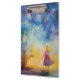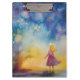 Uma prancheta doce e balbuciosa. A ilustração da aquarela mostra uma jovem vestida de rosa olhando para o céu noturno.