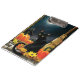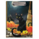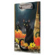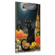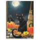 Um gato preto se senta na porta com abóboras, lanterna, vassoura, folhas de outono e lua de colheita de cheio atrás.