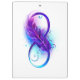 Símbolo do infinito com uma bela pena pintada em cores vibrantes roxas e azuis sobre um fundo branco.