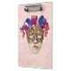 Uma máscara de pijester com aparência de porcelana rachada é adornada com padrões de ouro elaborados. A máscara apresenta fitas vibrantes e ondulantes em tons roxos e vermelhos, cada uma pontada com pequenos sinos. O efeito geral é simultaneamente misterioso e festivo. Linda cor-de-rosa, fundo floral vintage
