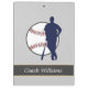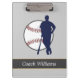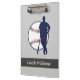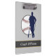 Este é um conselho de grampo personalizado excelente para qualquer um que é um fã de basebol verdadeiro, ou para dar como um presente a um treinador ou a um jogador. Caracteriza uma silhueta azul do jogador de beisebol e do bastão contra uma imagem branca da bola completa com a costura vermelha. Seu nome ou o outro texto estão no branco em uma bandeira preta alinhada ouro abaixo da imagem. A imagem é colocada em uma luz - gráficos Factory.com do © da imagem dos usos do design das cinzas background.*This *