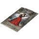 Renderização digital em 3D de um belo feiticeiro feminino em um vestido vermelho e preto com asas em um fundo de castelo fantasticamente assustador