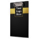 Esta área de transferência preta tem uma imagem de exibição próxima ao topo na frente. Você pode substituir a imagem pelo logotipo de sua empresa. Os detalhes falsos do ouro NÃO são feitos de folha.
