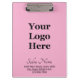 Esta área de transferência de rosas claro tem uma imagem de exibição que você pode substituir pelo logotipo da sua empresa. A área de transferência também tem quatro linhas de texto de exibição em preto. A linha de cima é um roteiro elegante. As outras três linhas não são um roteiro. Você pode editar o texto para mostrar o nome do salão, endereço, número de telefone ou uma mensagem personalizada.