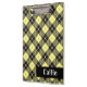 Padrão de verificação da diagonal "lumberjack" preto e amarelo pastel com cobertura de grade de ouro mate. Texto personalizável em letra branca moderna nesta área de transferência personalizada.