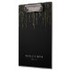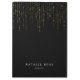 A área de transferência em preto chic apresenta duas linhas de texto personalizado em letras brancas clássicas, em um fundo preto rico com linhas verticais de linhas de cordas de folhas falsas em ouro em cascata a partir do topo. Design repete-se no lado oposto.