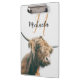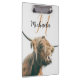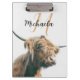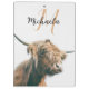 Monograma inicial do retrato das vacas altas. Fotografia de um majestoso gado de terras altas, laranja-acastanhadas, num dia nevado, com fundo branco.