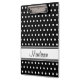 Este design com padrão tem um fundo preto com bolinhas brancas na frente e atrás. O nome está em uma fonte de script dentro de faixas pretas e brancas e pode ser personalizado usando o campo modelo.