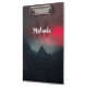 Fotografia paisagística de um pôr do sol irreal tirada no lago Lago di Fusine, Itália. A cor vermelha é um pouco exagerada, mas parada na vida real ela realmente sentia assim. Em pouco tempo o sol se espalhou pela neblina e tão rápido desapareceu. Com um monograma personalizável no céu.