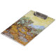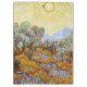 Oliveiras com céu amarelo e sol. Vincent Willem van Gogh. Paisagem em tons amarelo quente. Grande jardim com árvores grandes. Montanhas no fundo. Há um grande sol brilhante no céu. Reprodução de famosas imagens de arte no dominio público.